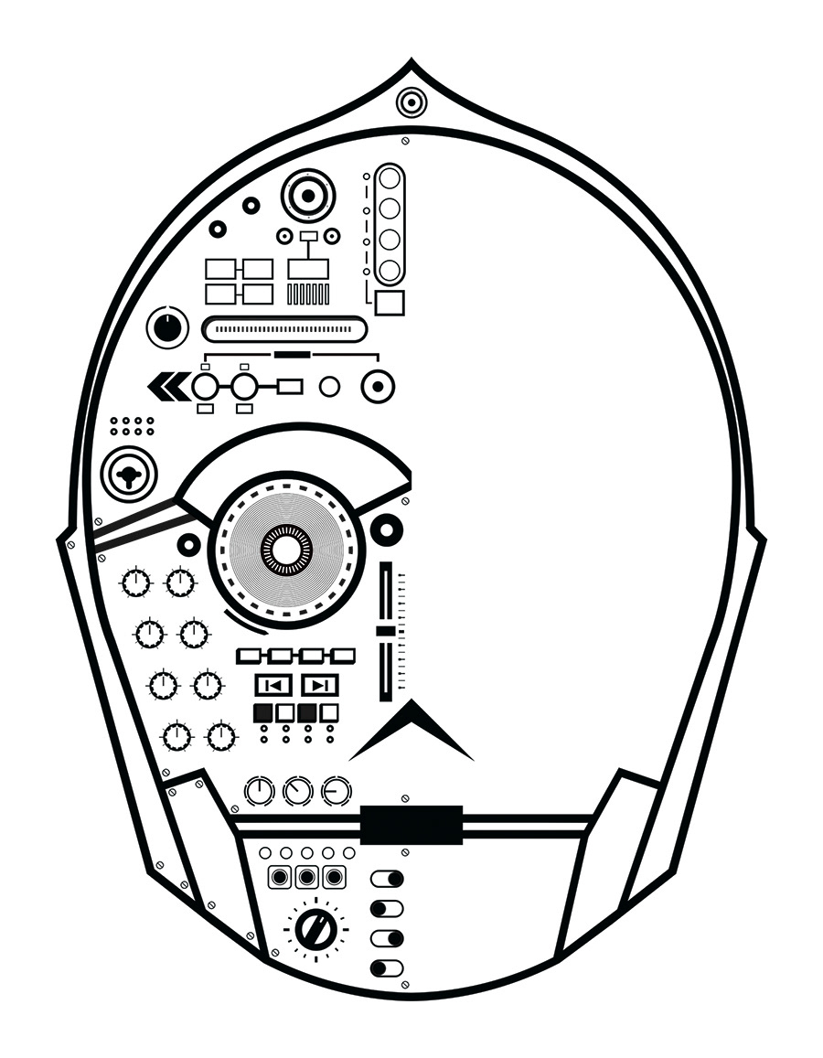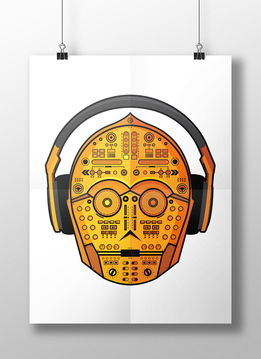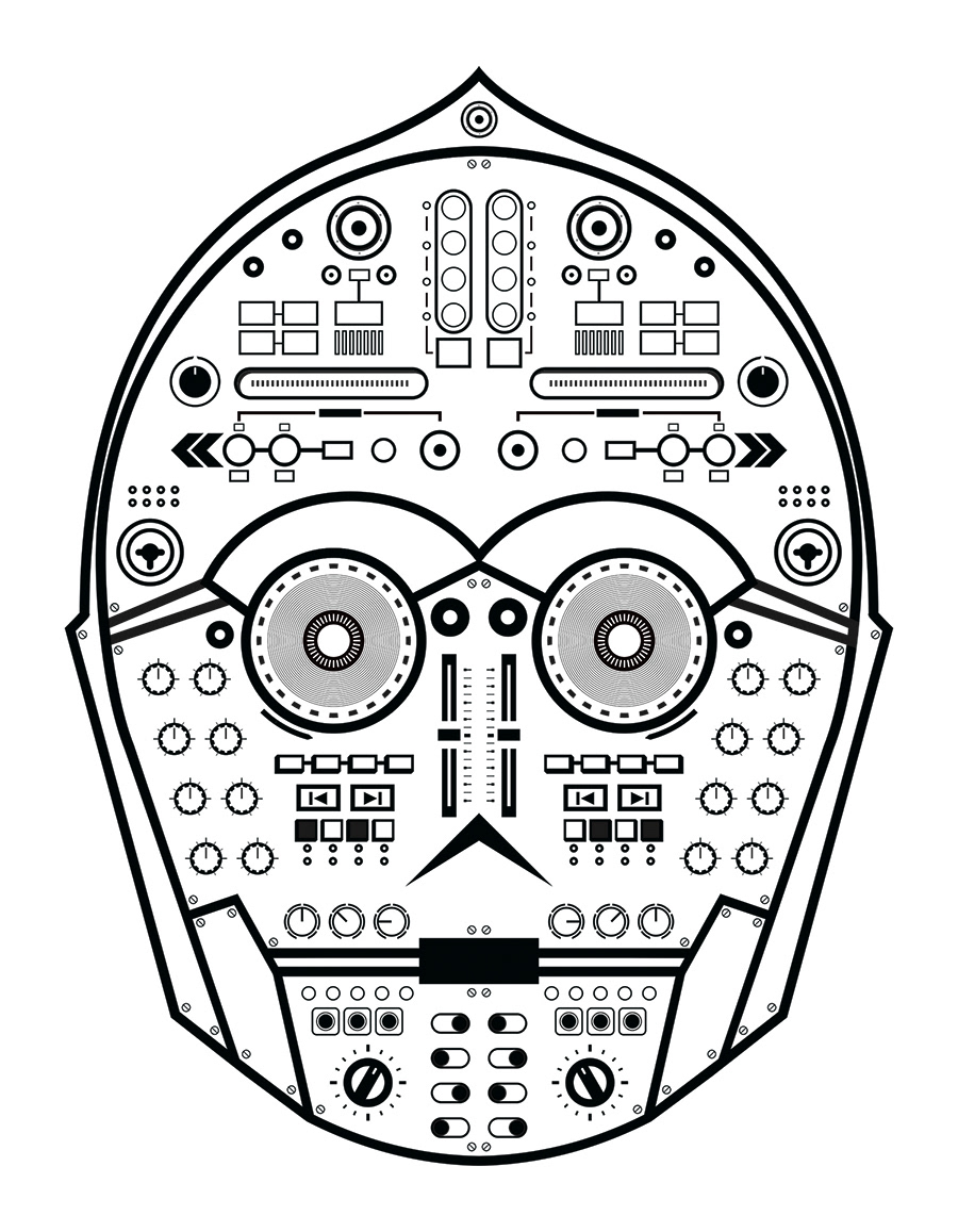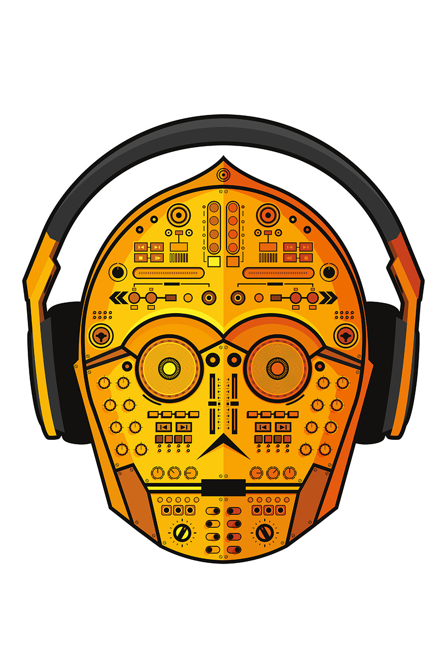 C-3PO made of DJ Equipment. Shirts, phone cases and prints can be purchased at http://www.designbyhumans.com/shop/men/dj-3po/26087/